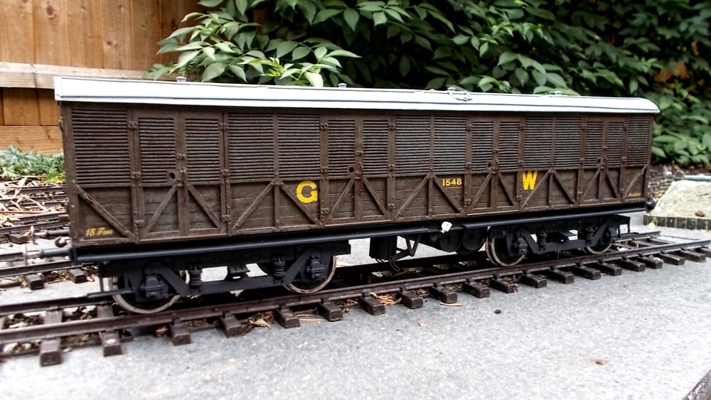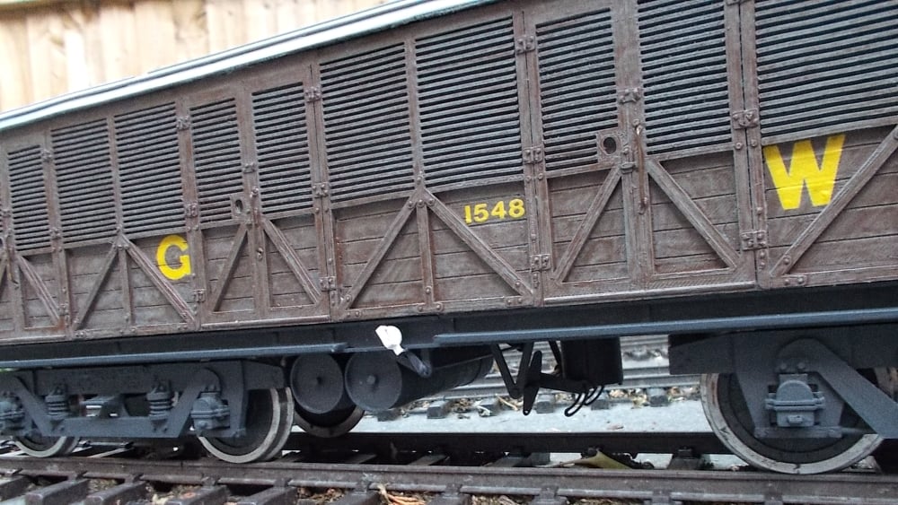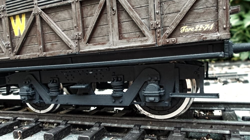3D printed model with plywood framing for internal box and turned steel buffer heads. Comes with pre-assembled screw couplings and pair of your choice of bogies.